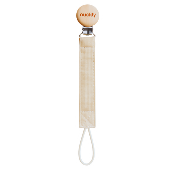 Die Nuckly Schnullerkette hält den Lieblingsschnuller deines Babys sicher in Reichweite – mit einem Clip aus echtem Holz, einem Stoffband aus reiner Baumwolle und ganz ohne Plastik.